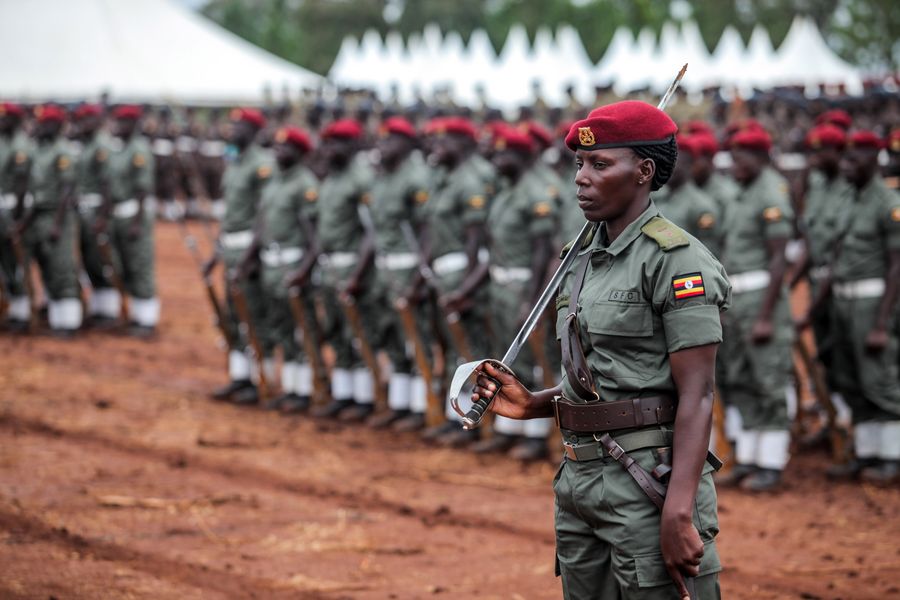 Uganda People's Defence Force (UPDF) soldiers take part in a parade during the 39th Tarehe Sita Military anniversary in Nakaseke district, central Uganda, Feb. 6, 2020. (Xinhua/Hajarah Nalwadda)