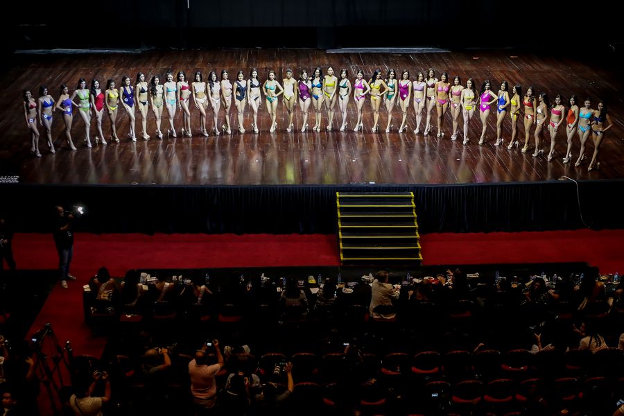 Contestants pose onstage during the final screening of candidates for the Binibining Pilipinas (Miss Philippines) 2020 beauty pageant in Quezon City, the Philippines, Feb. 6, 2020. (Xinhua/Rouelle Umali)