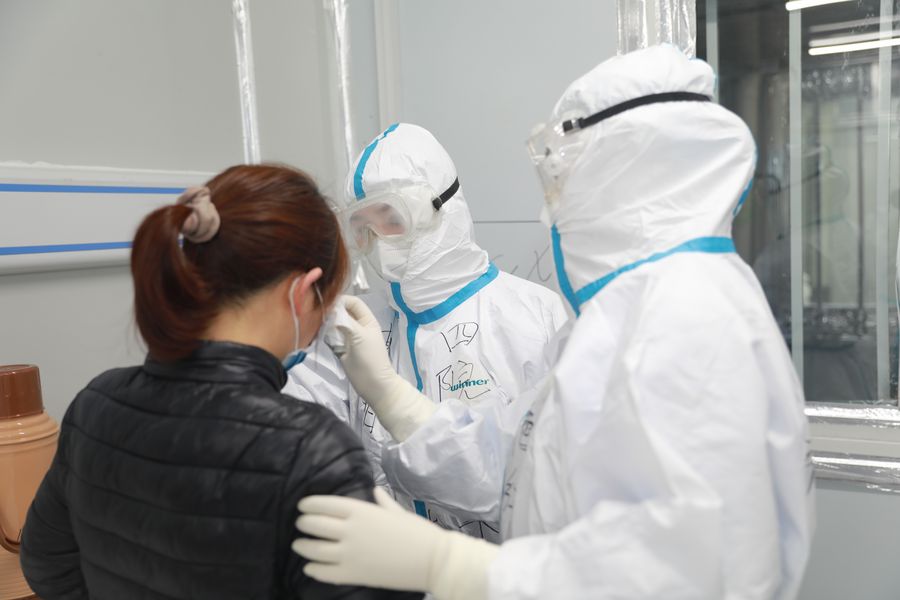 Medical workers console a newly admitted patient at the Leishenshan (Thunder God Mountain) Hospital in Wuhan, capital of central China's Hubei Province, Feb. 16, 2020. The hospital admitted one hundred COVID-19 patients on Sunday. (Photo by Gao Xiang/Xinhua)