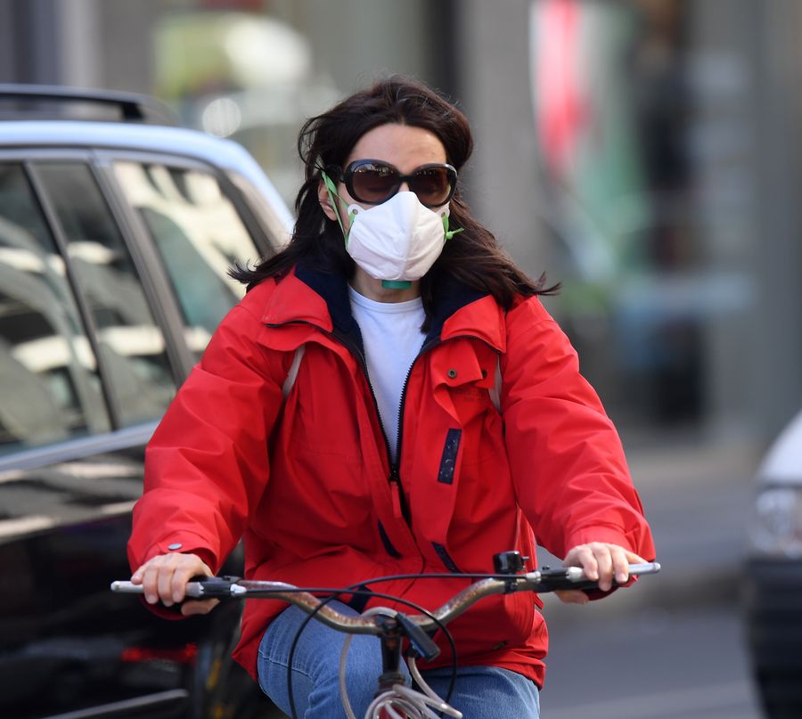 A woman wearing a mask rides a bicycle in Milan, Italy, on Feb. 24, 2020. (Photo by Daniele Mascolo/Xinhua)