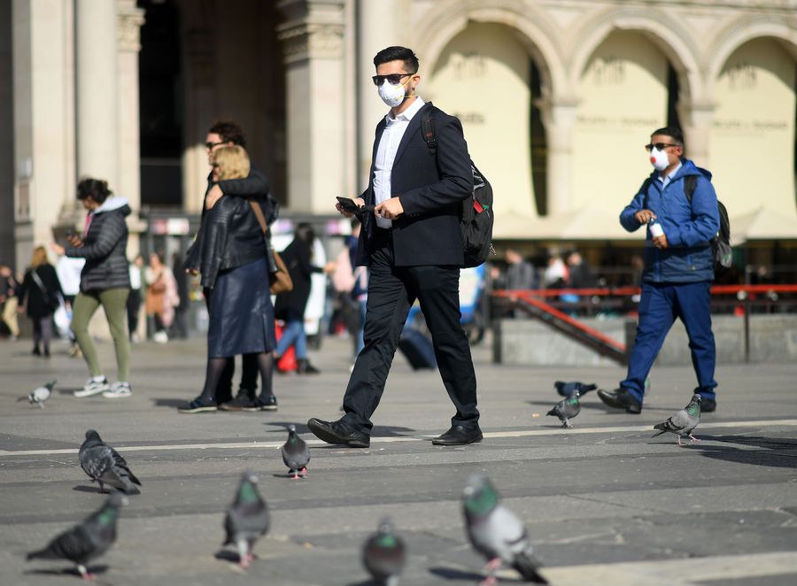 People wear masks as they walk in Milan, Italy, on Feb. 24, 2020. (Photo by Daniele Mascolo/Xinhua)