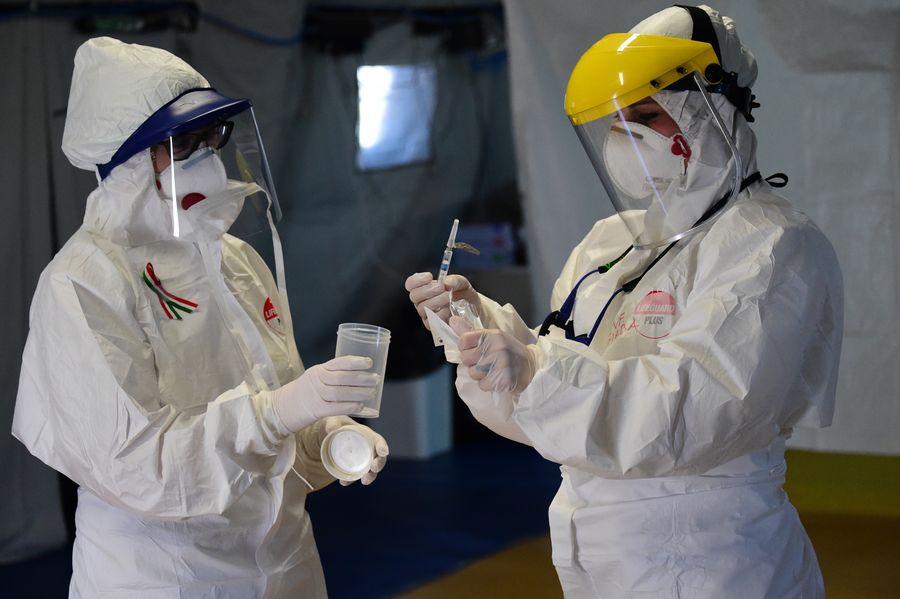 Healthcare workers check samples for further testing in Bologna, Italy, March 23, 2020. (Photo by Gianni Schicchi/Xinhua)