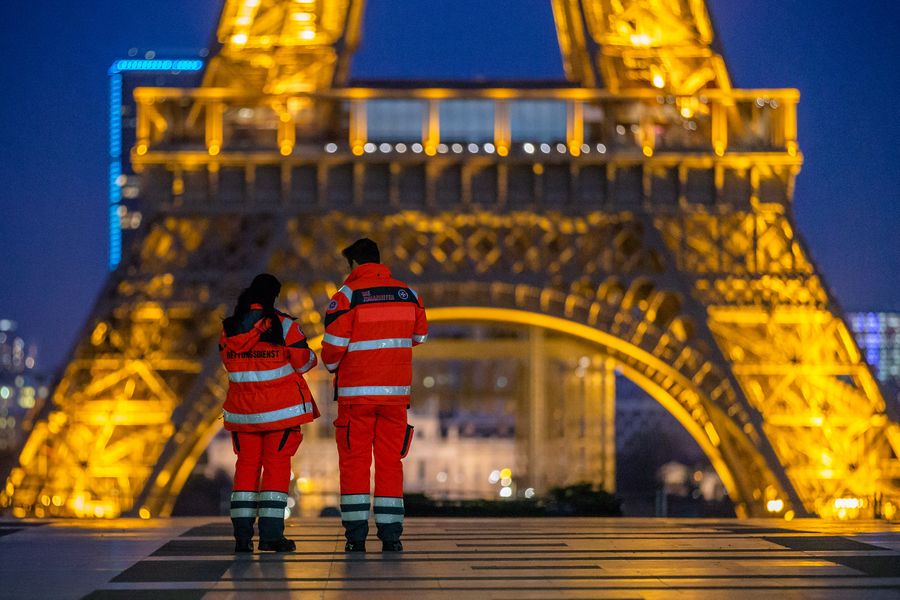 The Eiffel Tower glitters twice as long as usual to thank and support hospital staff during the outbreak of the coronavirus pandemic in Paris, France, March 23, 2020. (Photo by Aurelien Morissard/Xinhua)