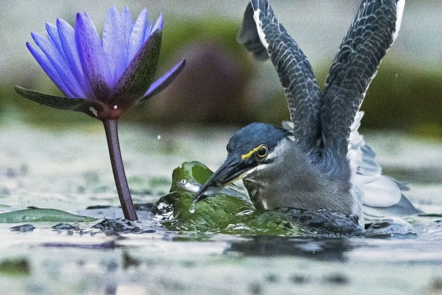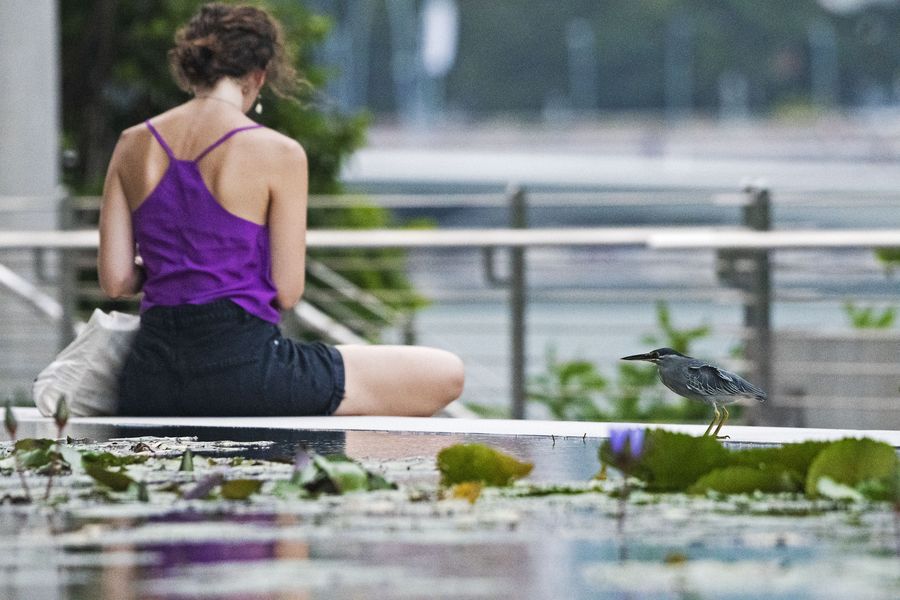 A striated heron (Butorides striata) hunts at a pond outside Singapore's ArtScience Museum on April 1, 2020. (Photo by Then Chih Wey/Xinhua)