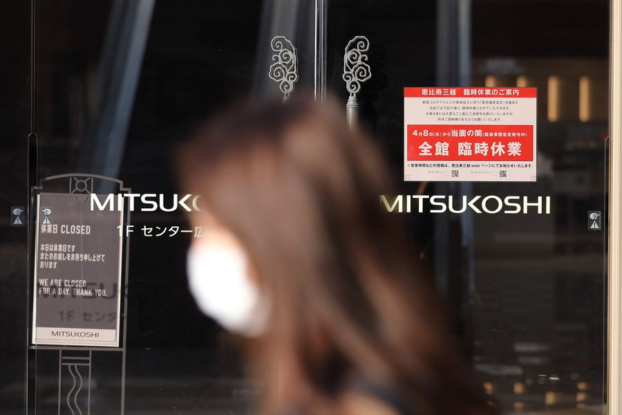 A woman wearing mask passes a closed department store in Tokyo, Japan, April 8, 2020. (Xinhua/Du Xiaoyi)