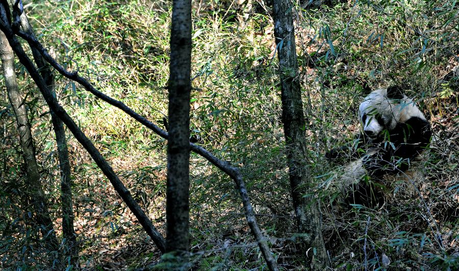 A wild Qinling panda eats bamboo leaves in Daguping Village of Yueba Township in Foping County, northwest China's Shaanxi Province, March 27, 2016. There are estimated to be 345 Qinling pandas, a subspecies of the giant panda, living in the wild, according to China's fourth survey of giant pandas from 2011 to 2014. (Xinhua/Tao Ming) (lfj)