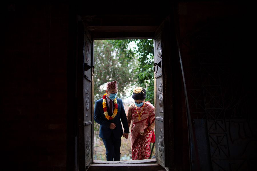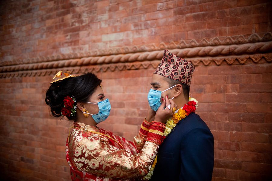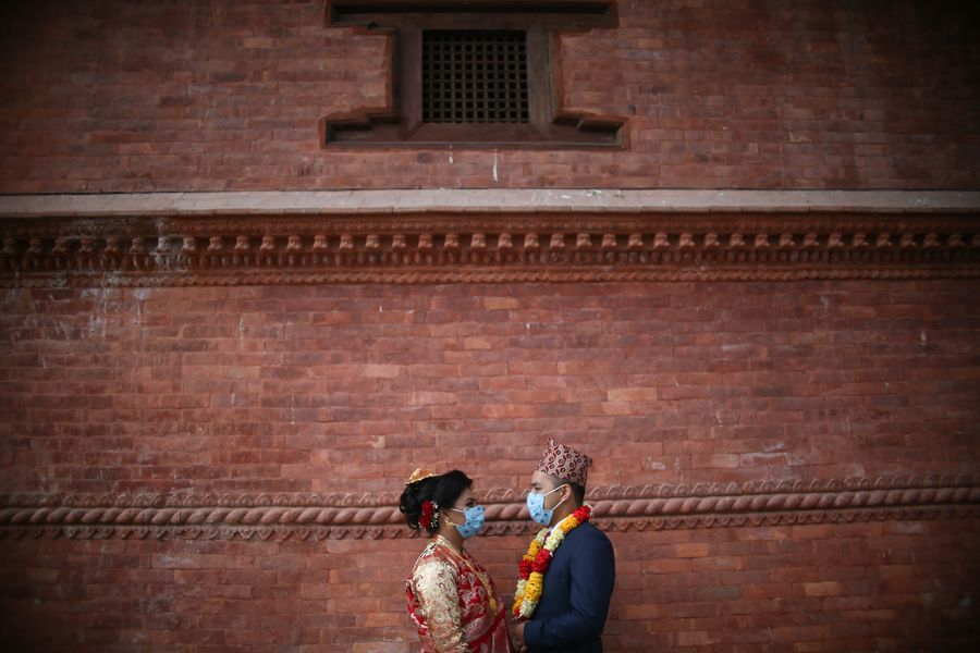 A bride and her groom wear face masks at their wedding ceremony in Kathmandu, Nepal, on May 1, 2020. (Photo by Sulav Shrestha/Xinhua)