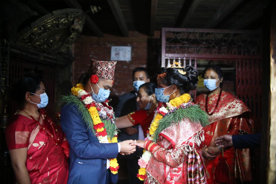 A bride and her groom wear face masks at their wedding ceremony in Kathmandu, Nepal, on May 1, 2020. (Photo by Sulav Shrestha/Xinhua) ■