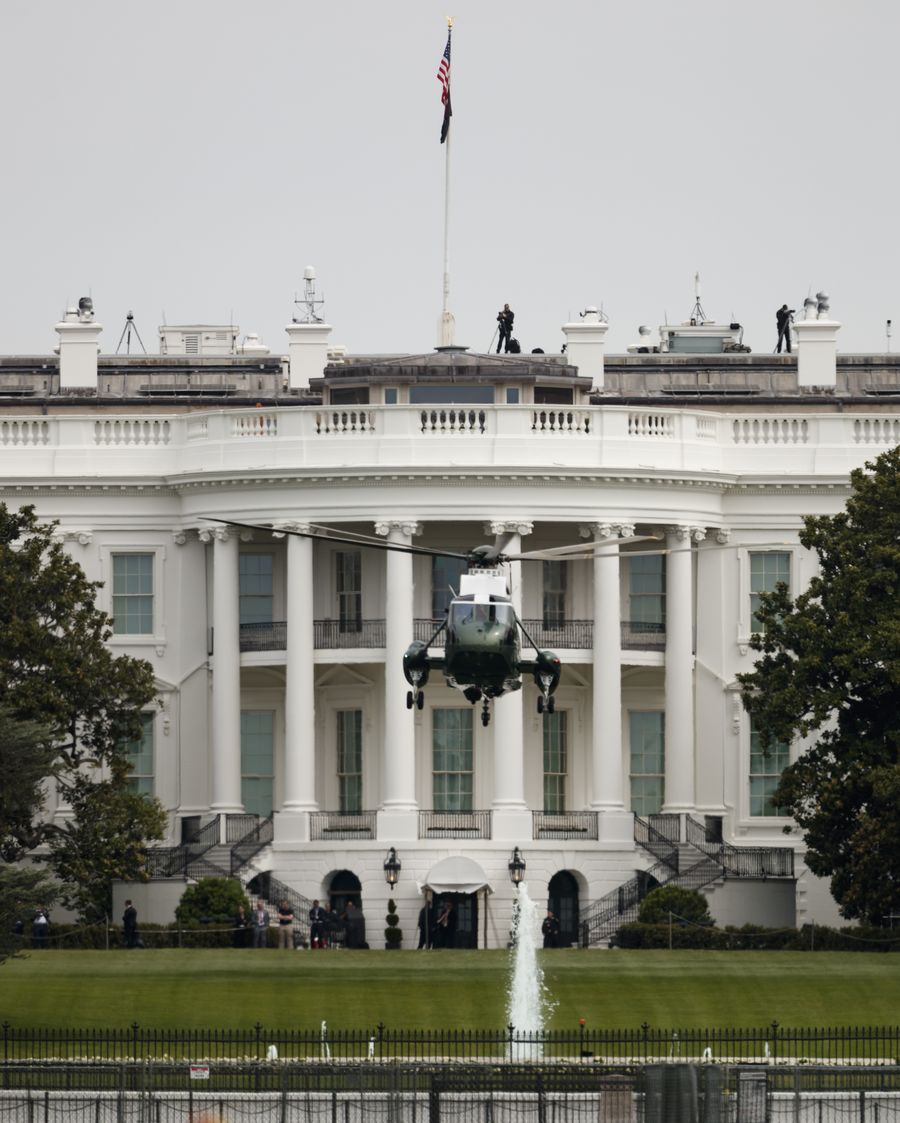 Marine One carrying U.S. President Donald Trump takes off from the South Lawn of the White House in Washington D.C., the United States, on May 5, 2020. (Photo by Ting Shen/Xinhua)