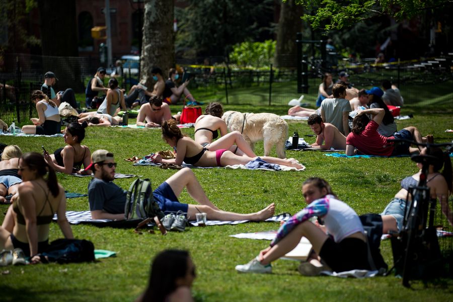 People have fun at Washington Square Park in New York, the United States, as the temperature rises on May 3, 2020. (Photo by Michael Nagle/Xinhua)