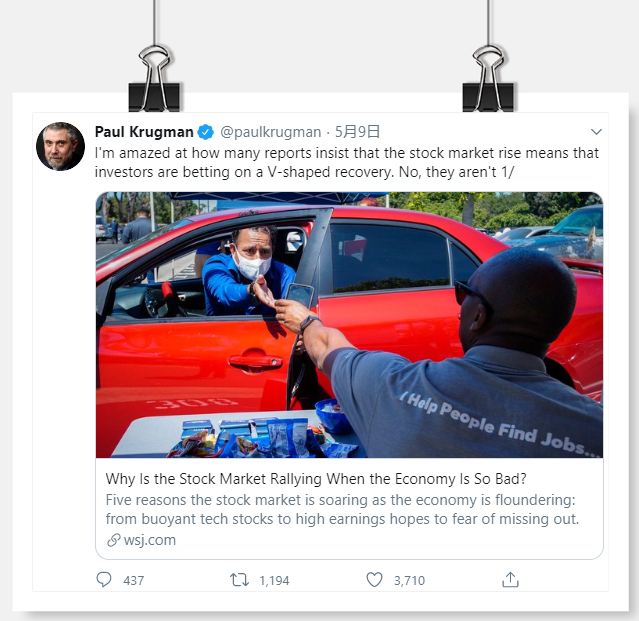 "I'm amazed at how many reports insist that the stock market rise means that investors are betting on a V-shaped recovery. No, they aren't," Krugman said in a series of tweets.