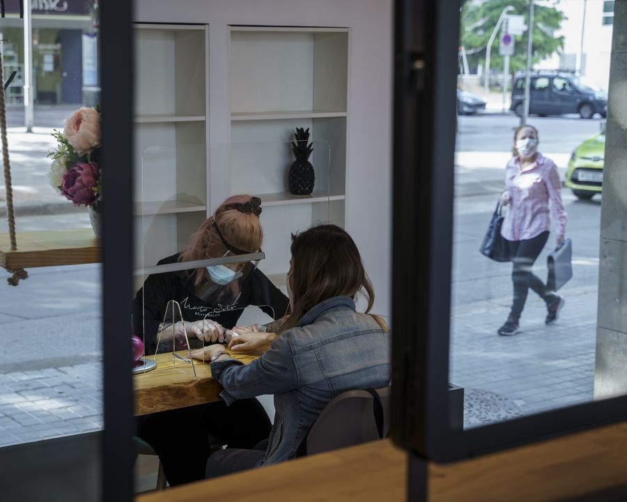 The Marta Soto Beauty Salon opens with the sanitary security measures taken in Molins de Rei, Spain, May 8, 2020. (Photo by Joan Gosa/Xinhua)