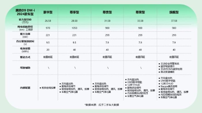 这里我们以车型最全的腾势D9 2024款DM-i为例为你解析。