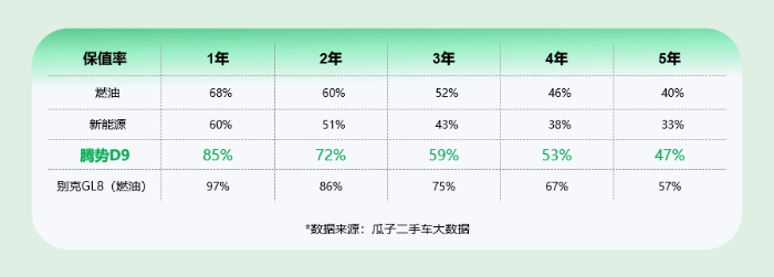在二手车市场,保值率永远是衡量车型价值的黄金标准。瓜子二手车大数据显示,腾势D9的首年保值率高达86%,三年保值率59%,虽然数值上逊于燃油款的GL8,但也远超新能源车型的平均保值水平。