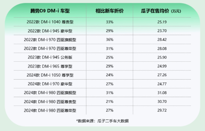 我们将腾势D9的二手价划分为三大区间:预算25万以内,可以选择2022款豪华型,目前瓜子二手车在售均价23.7万,是务实派首选。