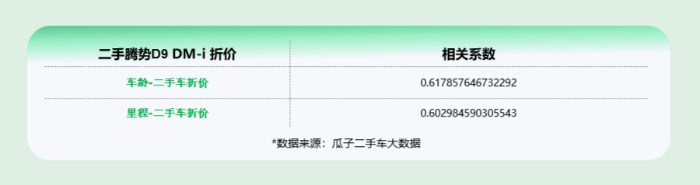 根据瓜子二手车大数据测算,腾势D9二手车价格与车龄的相关系数为0.62,与里程的相关系数为0.60,车龄和里程对价格的影响程度相当。