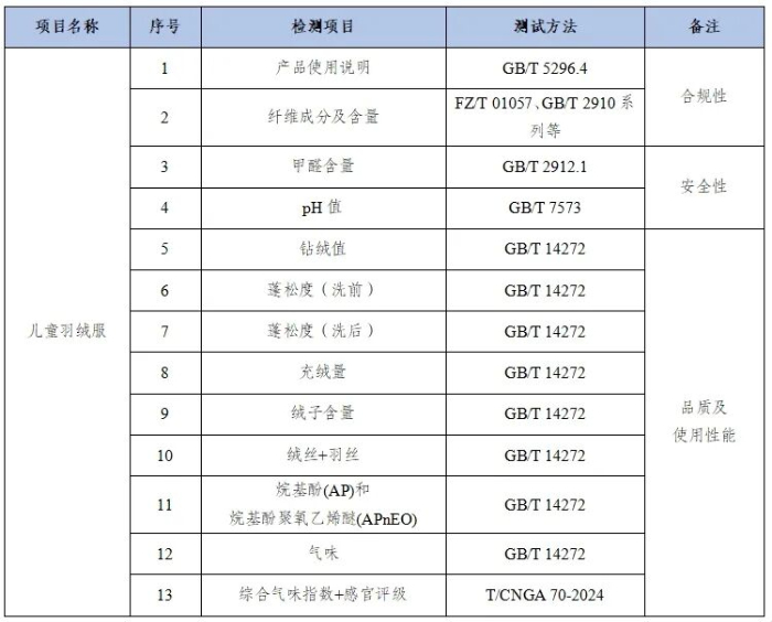 本次比较试验依据GB 31701-2015《婴幼儿及儿童纺织产品安全技术规范》、GB/T 5296.4-2012《消费品使用说明 第4部分 纺织品和服装使用说明》、GB/T 14272-2021《羽绒服装》以及T/CNGA 70-2024《羽绒羽毛气味的检测和评价湿态激发法》等标准进行检测。所有检测数据仅用于比较分析,不做判定。30款样品的比较试验测试项目及其依据详见表1。