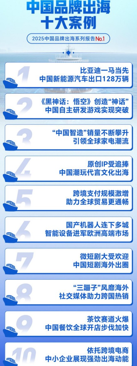 《报告》展示了2024年具有代表性的中国品牌出海十大案例。比亚迪稳居全球新能源车销量榜首、《黑神话:悟空》创造自主研发游戏“神话”、“中国智造”引领家电潮流、泡泡玛特等原创IP加速出海、跨境支付规模激增、国产机器人进军欧洲高端市场、中国微短剧广受欢迎、国产“三蹦子”风靡海外、中国餐饮全球开店步伐加快、中小企业展现强劲出海动能等入选十大案例。