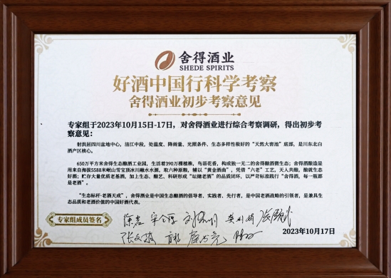 不久前,好酒中国行科学考察(第二季)走进舍得酒业。一众专家在全方位考察调研后,得出了“(舍得酒业)是兼具生态品质和老酒价值的中国好酒代表”的权威结论。此次借助这部生态故事大片的精准阐释,舍得“生态标杆 老酒天成”的美誉将进一步响彻行业。