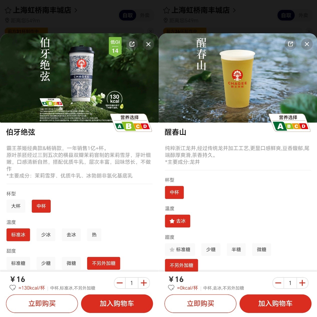 “营养选择”标识,由上海市疾病预防控制中心制定,根据饮料中非乳源性糖、非糖甜味剂、饱和脂肪、反式脂肪的含量对饮料进行综合分级,分级从A到D级,其推荐程度递减。其中,被评为A级的饮品需要满足非乳源性糖≤0.5g/100ml、饱和脂肪≤0.75g/100ml、反式脂肪≤0.3g/100ml,且不使用非糖甜味剂。遵循官方指导标准,霸王茶姬此前在上海门店销售的近七成产品,均获得AB级评级。
