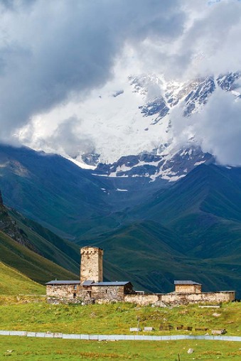 说话间,车窗外狂风怒吼、大雨滂沱,斯瓦涅茨基山脉一下子便被“溶”入风雨中。狂风暴雨过后,双彩虹悬挂在天地之间,层层云雾从谷底袭来,仿佛天女那飘忽的青丝长袖在缓缓舒展,小镇梅斯蒂亚就在眼前。梅斯蒂亚被海拔5000米以上的冰峰所环绕,其中海拔5642米的厄尔布鲁士山是欧洲最高的山峰。古里河穿城而过,夕阳下的梅斯蒂亚犹如一块金色的棋盘,金黄色的庄稼、粉红色的农舍被黄色的木栅栏分隔成一个个小方块,高大的塔楼像棋盘上的棋子,在雪山的衬托下蔚为壮观。