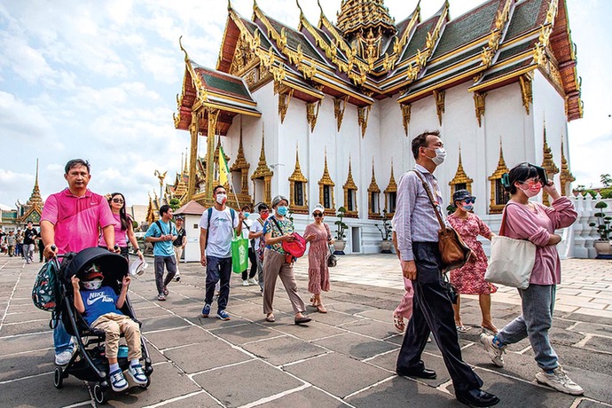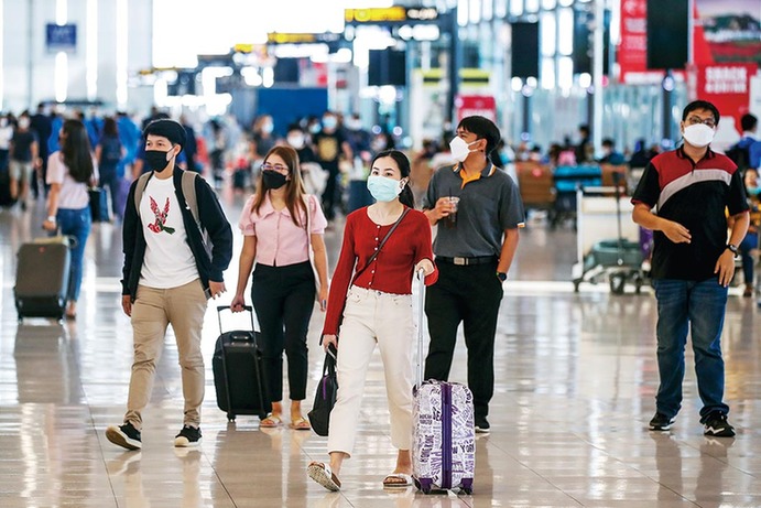 2021年12月27日,戴口罩的旅客走在泰国曼谷素万那普国际机场