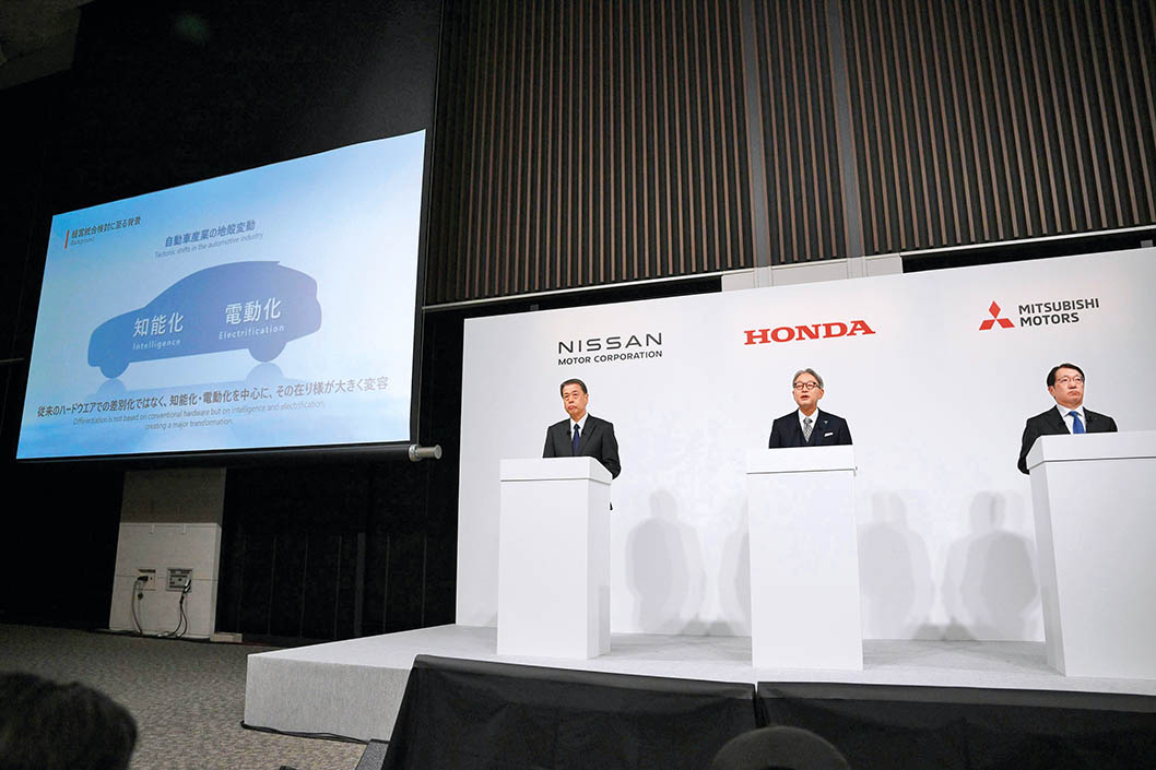 2024年12月23日,日产汽车公司社长内田诚(左)、本田汽车公司社长三部敏宏(中)和三菱汽车公司社长加藤隆雄在日本首都东京共同出席记者会