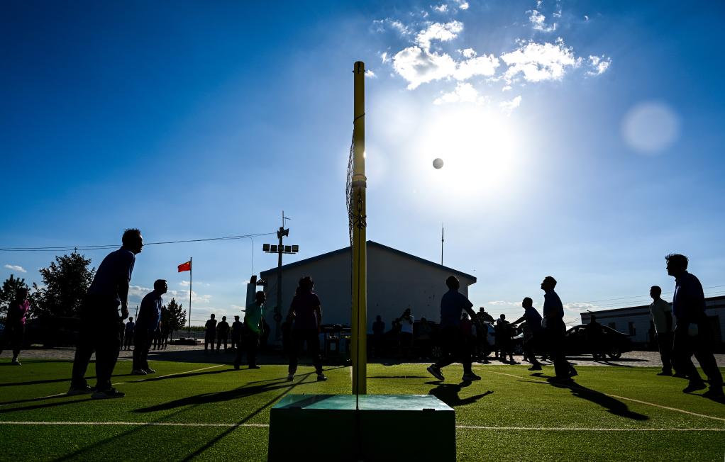 8月30日,在呼格吉拉图家,农牧民们在室外练习排球。新华社记者连振摄