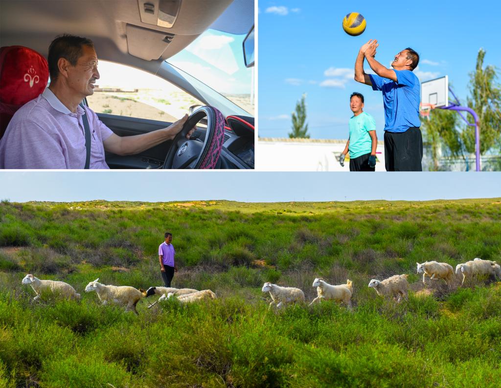 8月30日,昂素镇牧民吴任山开车前往排球场(左上,新华社记者连振摄);8月30日,吴任山在巴彦希里嘎查的排球场打球(右上,新华社记者彭源摄);8月30日,吴任山在草场放羊(新华记者彭源摄)新华社发