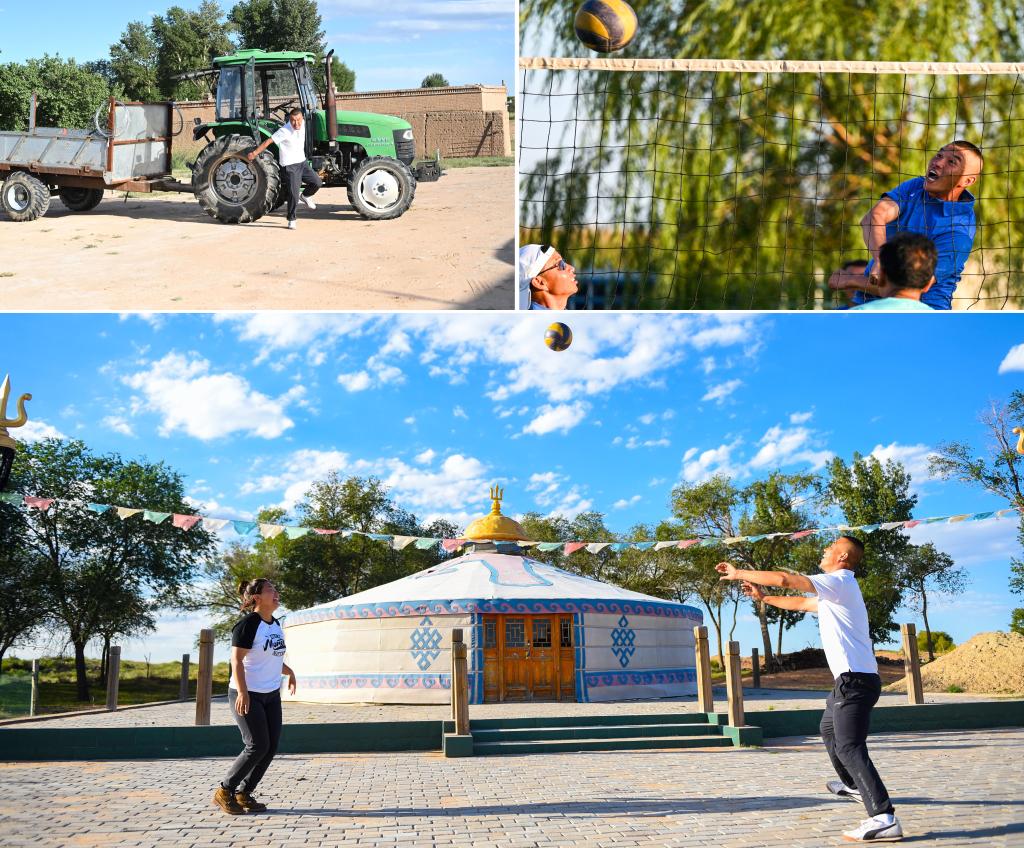 8月31日,昂素镇牧民乌勒吉那顺驾驶拖拉机拉草料(左上,新华社记者连振摄);8月30日,乌勒吉那顺在巴彦希里嘎查的排球场上打球(新华社记者连振摄);8月31日,乌勒吉那顺和妻子塔娜在自家开的“牧家乐”的蒙古包前打排球(新华社记者彭源摄)。新华社发