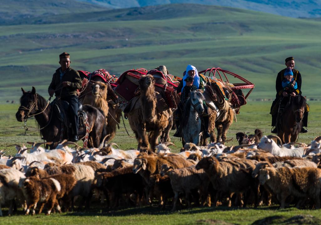 夏季,阿勒泰进入水草丰美期,云杉、冷杉等珍贵树木组成的西伯利亚泰加林郁郁葱葱,广袤草原生机勃勃,仿佛置身于一眼望不到边的绿色海洋,一场游走于天地间的生命大迁徙就此拉开帷幕——数百万只牛羊,由冬窝子转向夏牧场,一路逐水草而行。