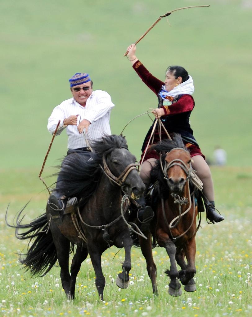 牧民进行“姑娘追”,这是哈萨克族一种传统马上体育游戏。新华社记者 沙达提 摄