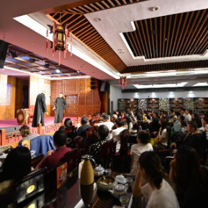位于天津市红桥区的谦祥益相声茶馆从老街估衣街搬进商场,在新业态滋养下,焕发出新活力。与现代化的商场装潢不同,谦祥益的大门古香古色,门厅处专设一小方天地,游客可从中领略天津相声的发展历程。馆内舞台四四方方,看台区整齐摆放着数十张八仙桌与实木椅,一侧放置可供观众借阅的曲艺民俗书籍。