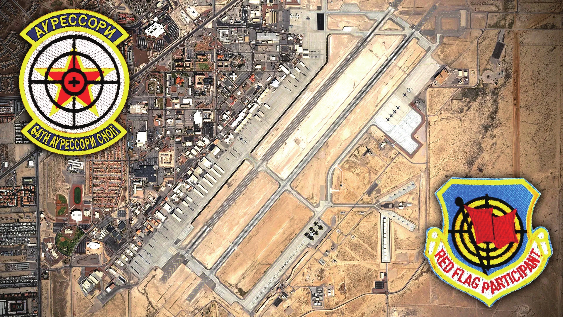 红旗军演的常驻地内利斯空军基地,上为64假想敌中队标,下为红旗军演标。