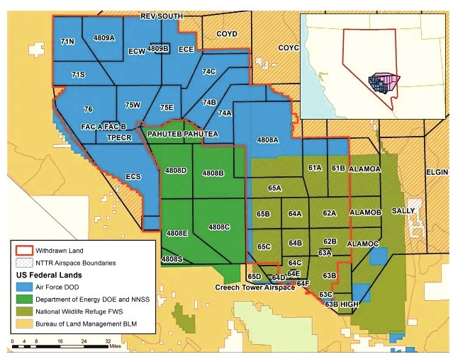 右上角小图红框为内华达州界,下方颜色区域为内华达试验和训练靶场(NTTR),该训练场是红旗军演的主要场地,涵盖了内华达州南部的大部分地区。