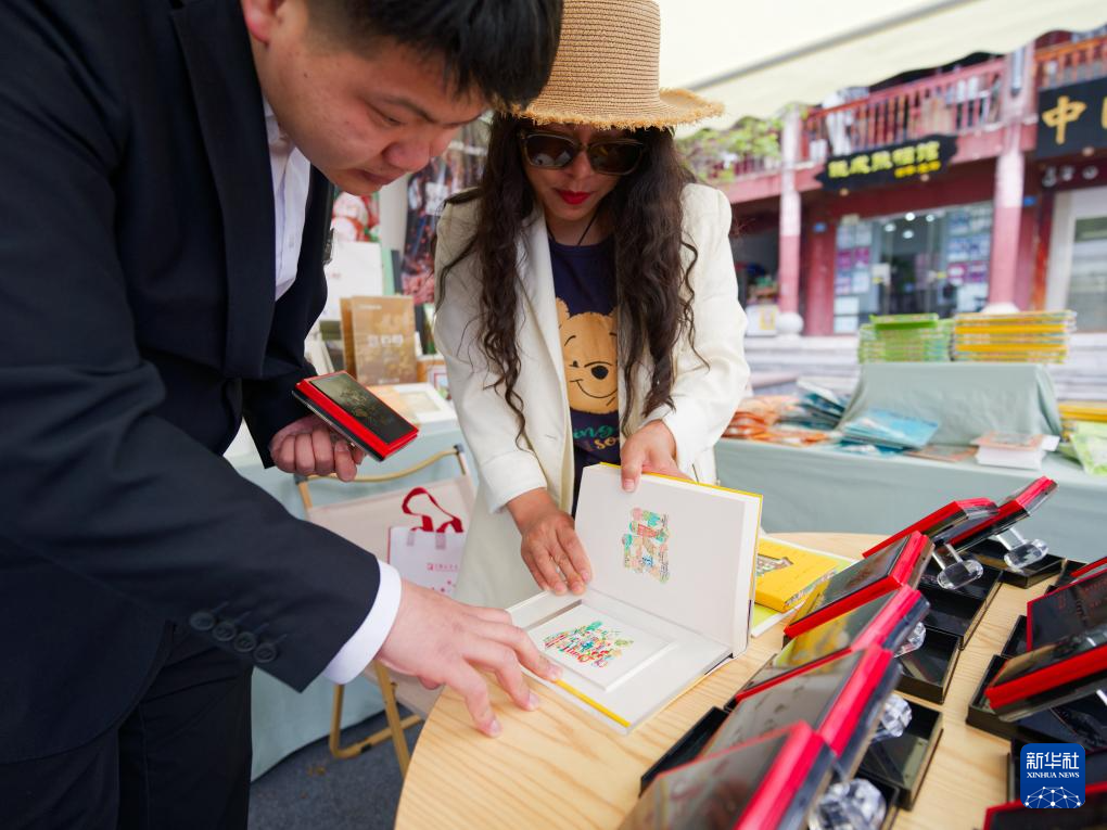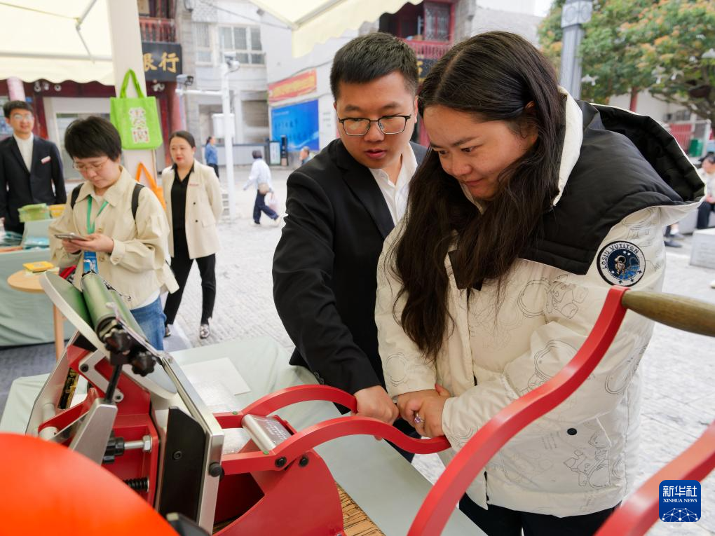 4月22日,市民在云南省昭通市全民阅读大会活动现场制作活版印刷明信片。