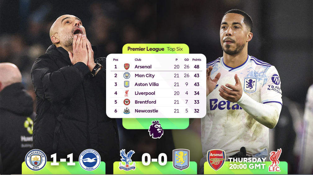 英超综合 | 曼城、维拉遭遇平局 阿森纳有望扩大榜首优势