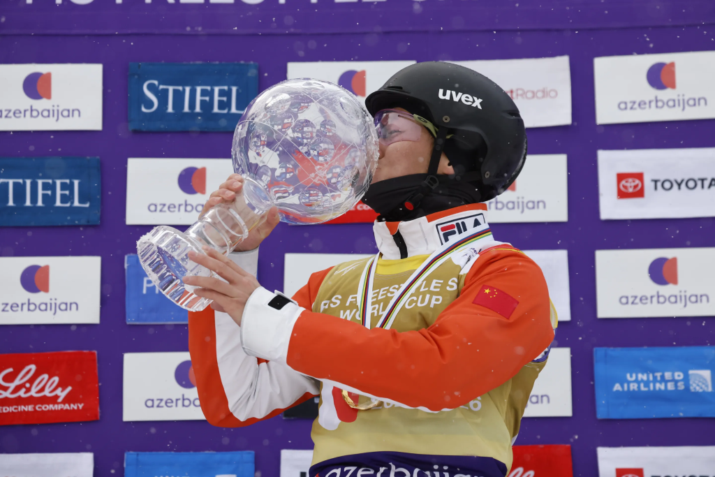 孙佳旭捧起象征总冠军的水晶球奖杯。图片来自国际雪联官网