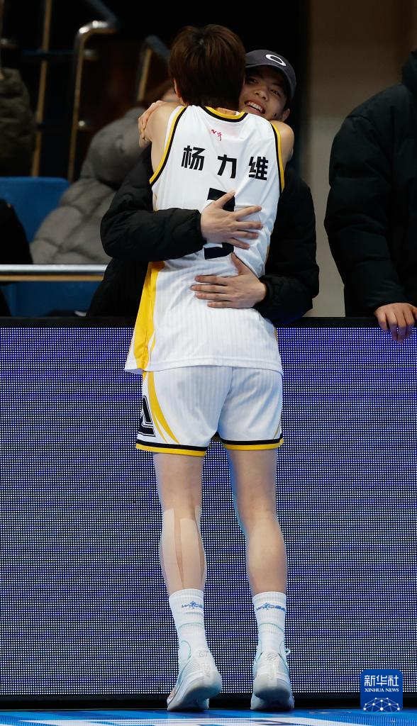 1月20日,参加女篮国家队集训的广东东莞新彤盛队球员杨舒予(后)在开赛前与姐姐杨力维拥抱。