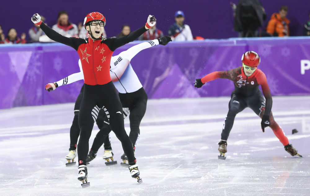 ↑2018年2月22日,武大靖在平昌冬奥会短道速滑男子500米决赛中夺冠。