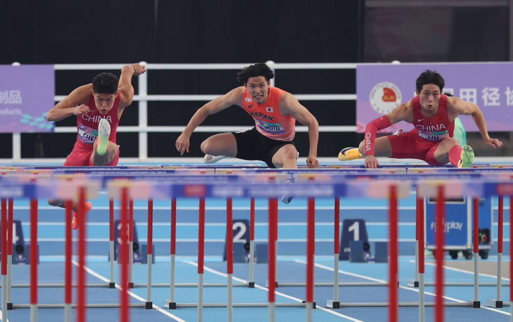 2月7日,冠军中国选手刘俊茜(右)、亚军日本选手野本周成(中)、季军中国选手陈圆将(左)在男子60米栏决赛中。新华社记者 孙凡越 摄