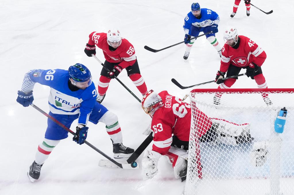 2月17日,意大利队和瑞士队球员在比赛中拼抢。新华社记者 陶希夷 摄