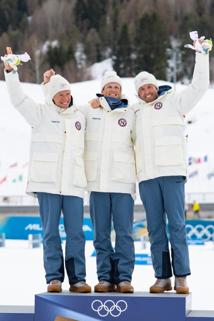 2月21日,亚军挪威选手尼格特、冠军挪威选手克莱博、季军挪威选手伊韦尔森(从左至右)在颁奖仪式上。新华社记者 黄伟 摄