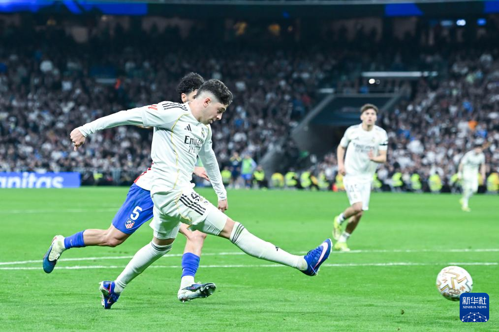 3月22日,皇家马德里队球员巴尔韦德在比赛中射门得分。