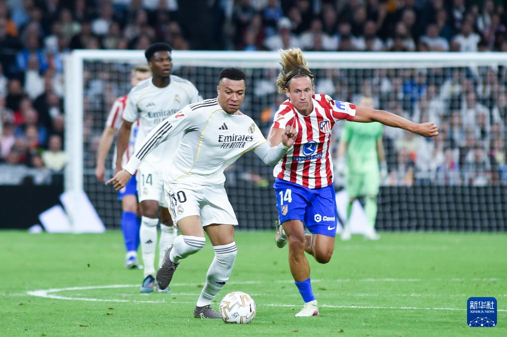 3月22日,皇家马德里队球员姆巴佩(左)与马德里竞技队球员略伦特在比赛中拼抢。