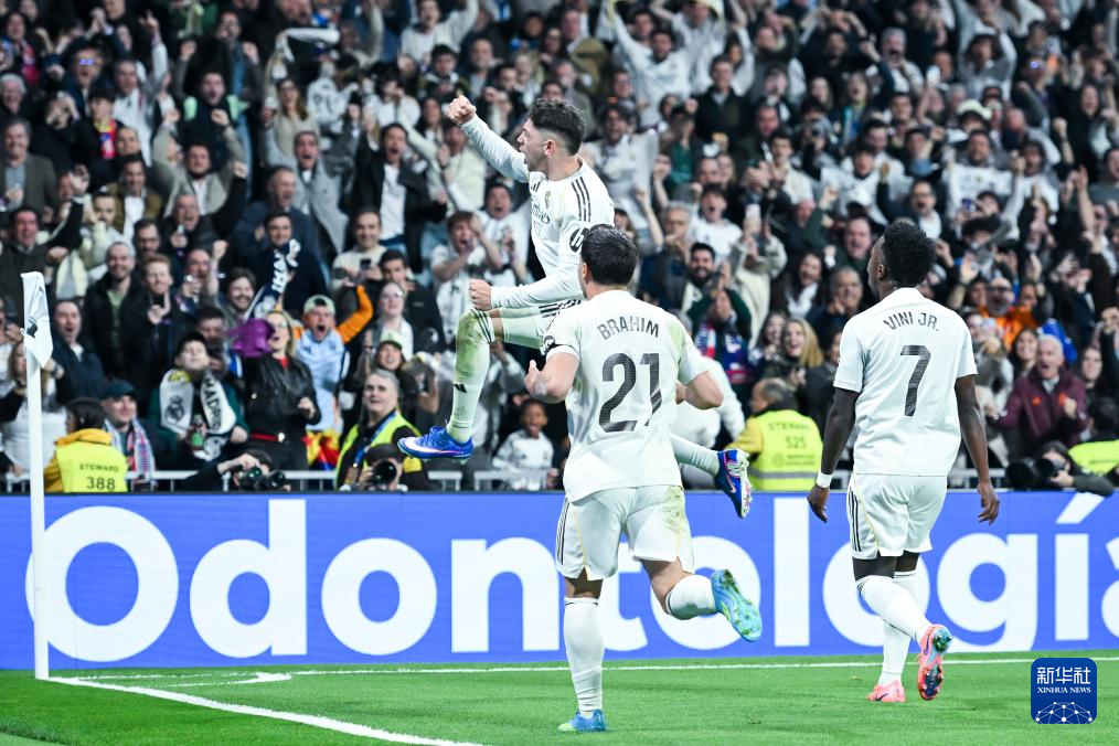 3月22日,皇家马德里队球员巴尔韦德(上)庆祝进球。