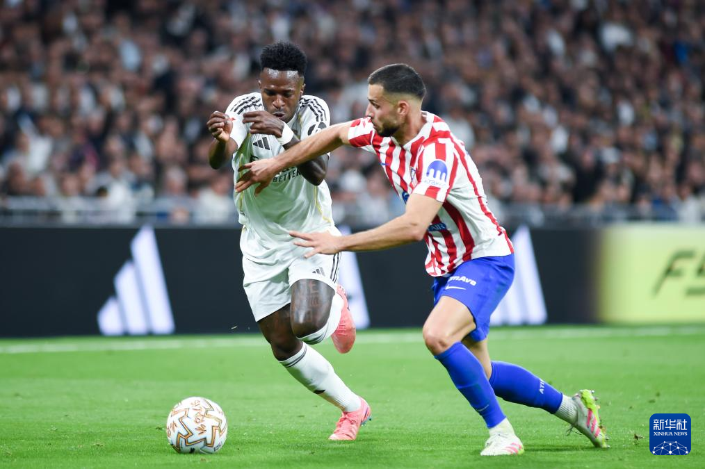 3月22日,皇家马德里队球员维尼修斯(左)与马德里竞技队球员汉茨科在比赛中拼抢。
