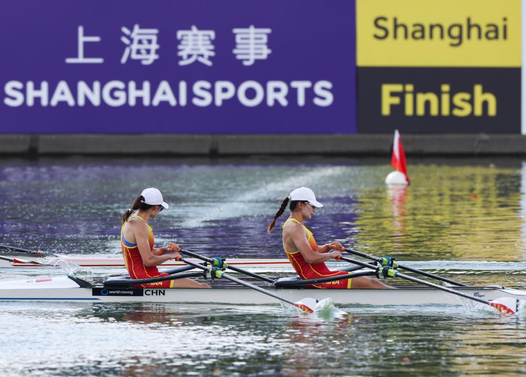 2025年9月26日,陈云霞(左)与张灵在比赛中。当日,在上海举行的2025年世界赛艇锦标赛女子双人双桨A组决赛中,中国选手陈云霞/张灵斩获银牌。新华社记者 丁汀 摄