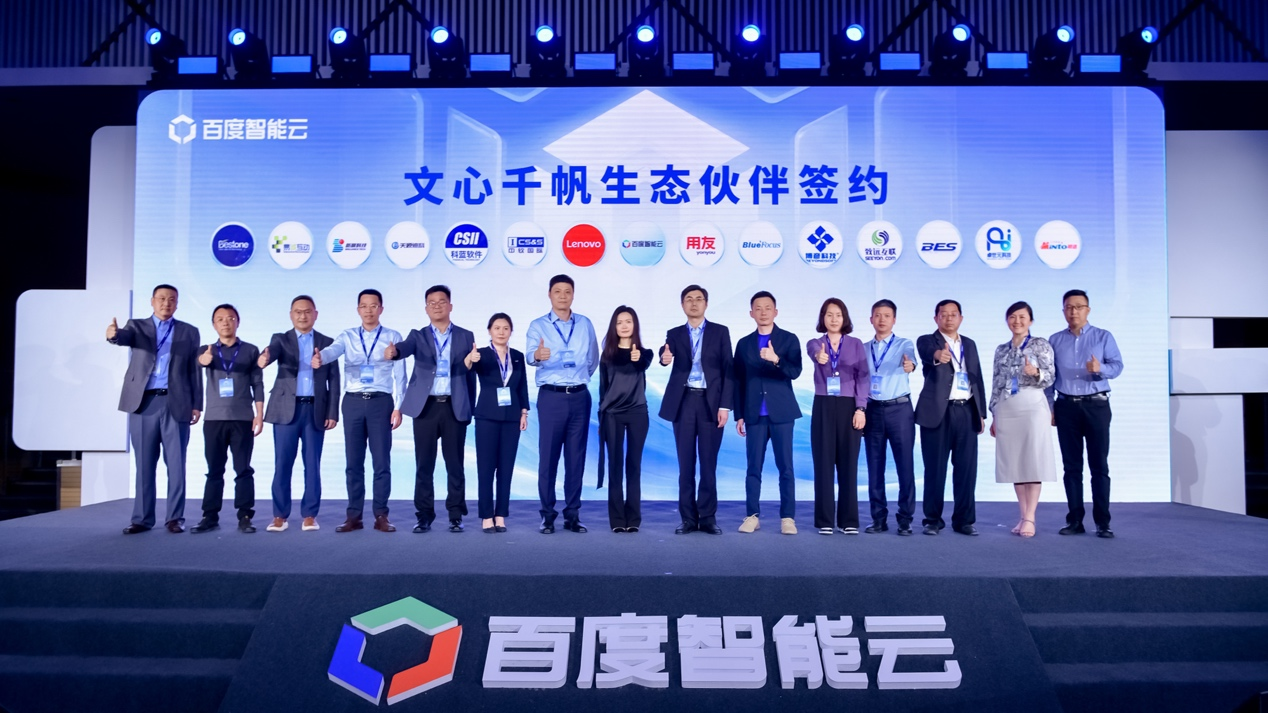 活动现场,百度智能云与联想集团、用友、宝兰德等14家文心千帆生态伙伴举行签约仪式。