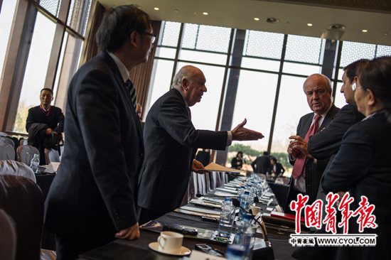 11月3日,“读懂中国”的闭门会议结束后,智利前总统拉戈斯与智利驻中国大使馆官员进行交流。本报记者 李隽辉/摄